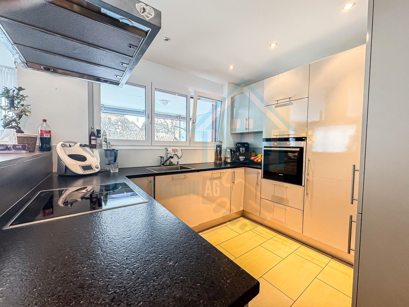 - Moderne, offene Küche mit Glaskeramikkochfeld, Backofen, Geschirrspüler, Dampfabzug sowie Kühl-/Gefrierkombination